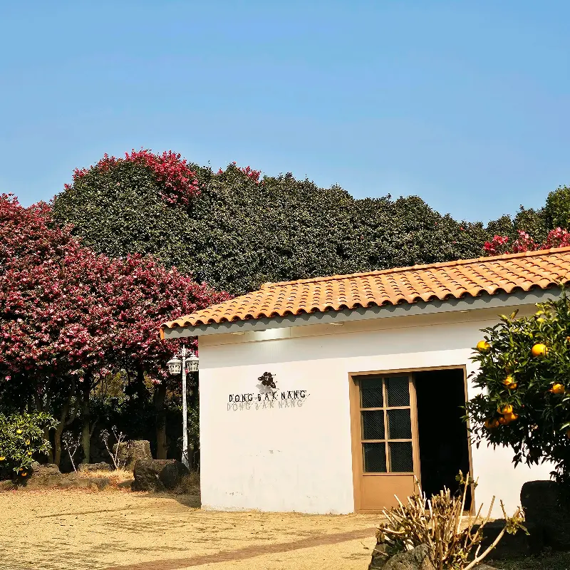 하얀 벽에 주황색 기와를 올린 아담한 건물이 눈에 들어오는데, 그 주변을 붉은 동백꽃 나무들이 겹겹이 둘러싸고 있는 거야. 거기에 귤 나무까지! 제주 감성 제대로 폭발하는 비주얼에 정신 놓고 셔터 누르기 시작📸. 햇살까지 따스하게 쏟아지니, 진짜 그림이 따로 없더라.