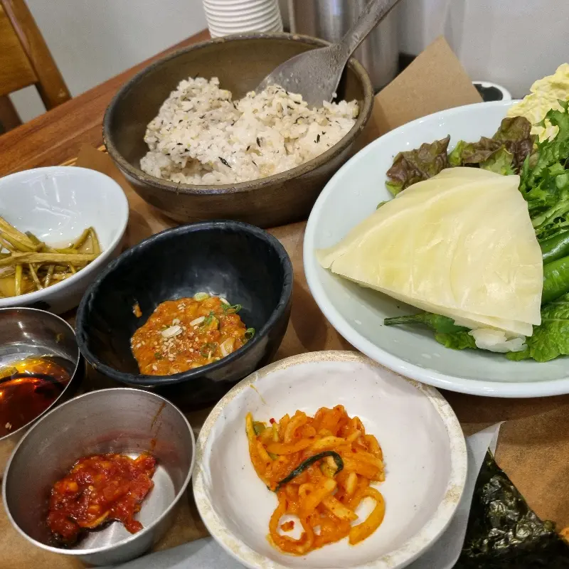 정갈한 밑반찬과 쌈 채소. 신선하고 다양한 밑반찬들이 메인 메뉴와 환상적인 조화를 이룬다.