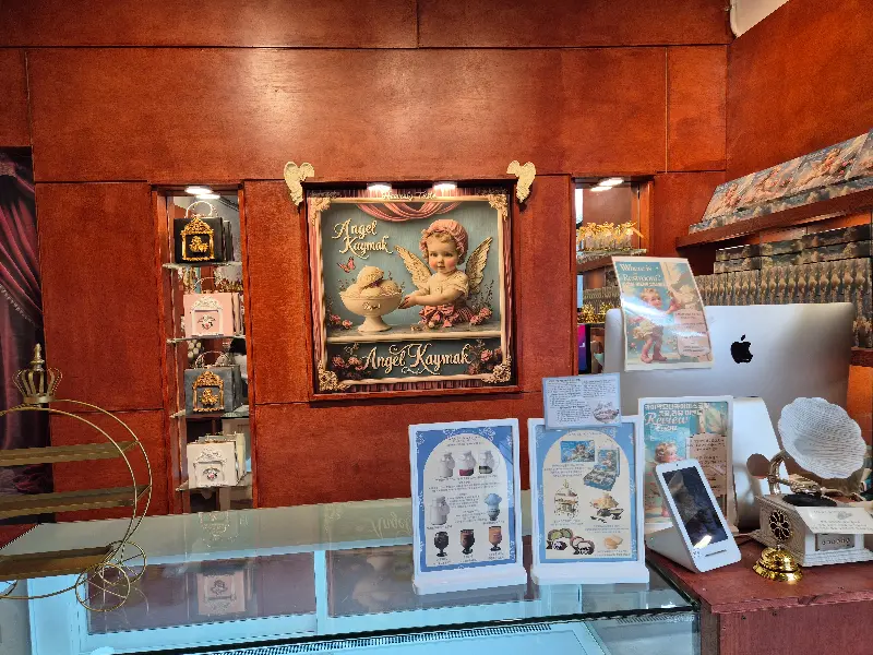 쇼케이스 앞에는 다양한 종류의 카이막이 진열되어 있는데, 각각의 카이막마다 예쁜 이름과 설명이 적혀 있어 고르는 재미를 더했다. 또한, 카운터에는 천사 콘셉트의 귀여운 굿즈들도 판매하고 있었는데, 기념품으로 구매하기에도 좋을 것 같았다.