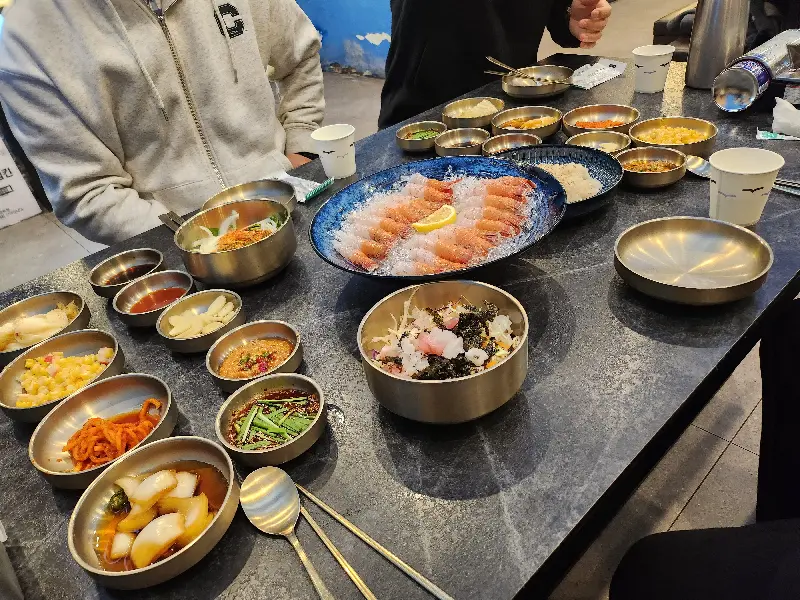 주문하고 얼마 안 돼서 밑반찬이 쫙 깔리는데, 완전 대박! 쌈 김, 양념밥, 묵은지, 갓김치, 깻잎 장아찌, 톳 무침, 회 초무침, 콘샐러드, 쌈장, 간장, 다진 마늘, 쌈 채소까지… 하나하나 정갈하고 맛있어 보이는 거 있지? 특히 톳 무침이랑 묵은지는 완전 내 스타일.