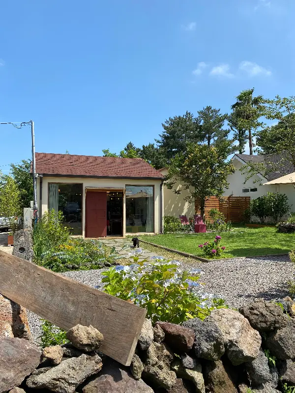 입구에서부터 느껴지는 힙한 분위기! 돌담과 야자수가 어우러진 정원은 마치 외국 휴양지에 온 듯한 착각을 불러일으켰어. 촌스럽게 ‘인증샷’ 남발하는 스타일은 딱 질색인데, 여긴 안 찍을 수가 없잖아! 누가 봐도 “나 지금 제주!”라고 온몸으로 외치는 듯한 풍경이랄까? 푸른 하늘 아래 펼쳐진 넓은 정원은 그 자체로 예술이었어. 선인장, 팜파스, 라벤더까지… 진짜 작정하고 꾸민 티가 팍팍 나는데, 과하지 않고 자연스럽게 어우러지는 모습이 완전 내 스타일!