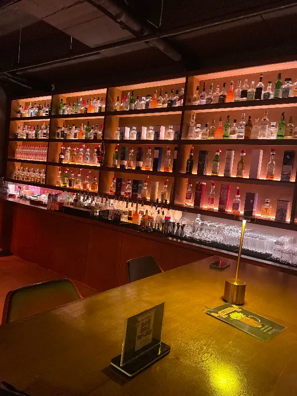 다양한 술병이 진열된 바 테이블 전경. 조명이 은은하게 비추는 모습이 인상적이다.