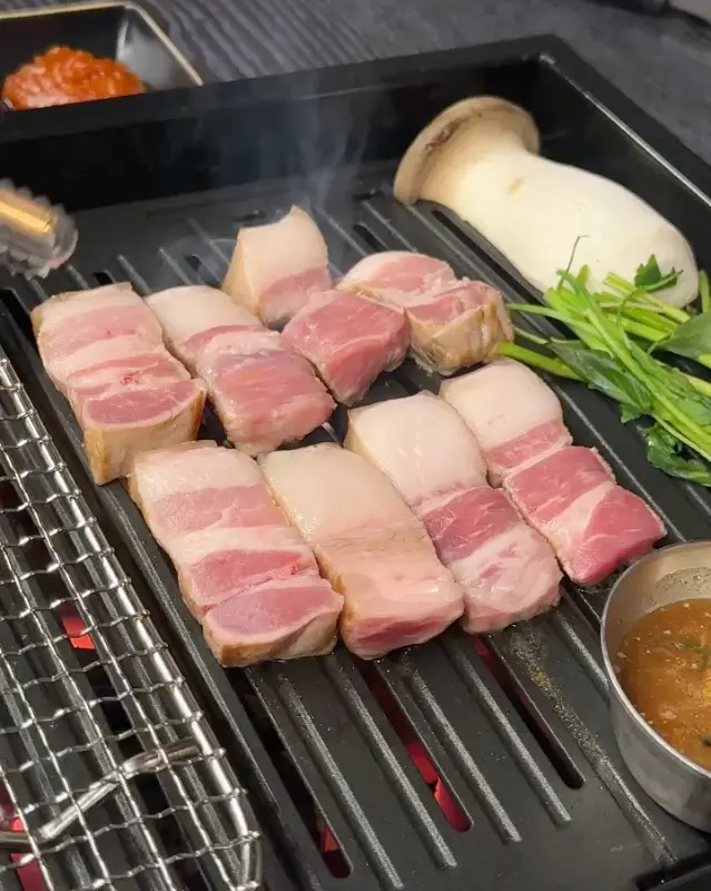 두툼한 흑돼지 근고기가 숯불 위에 올려지는데, 진짜 비주얼부터 장난 아니더라. 지글지글 익어가는 소리, 숯불 향까지 더해지니까 완전 식욕 폭발! 겉은 바삭하게 익고 속은 촉촉한 게 딱 내 스타일이었어. 직원분들이 직접 구워주셔서 더 편하게 먹을 수 있었지.