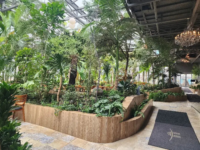 자리를 잡기 위해 안쪽으로 더 들어가 보니, 공간은 예상보다 훨씬 넓었다. 마치 미로처럼 구획된 공간 곳곳에는 다양한 식물들이 자라고 있었다. 잎이 넓은 야자수, 덩굴 식물, 이름 모를 꽃들이 저마다의 색깔을 뽐내고 있었다. 에서 보이는 것처럼, 나무 데크와 흙길이 자연스럽게 어우러져, 실내라는 느낌보다는 마치 야외 정원에 있는 듯한 기분이었다.