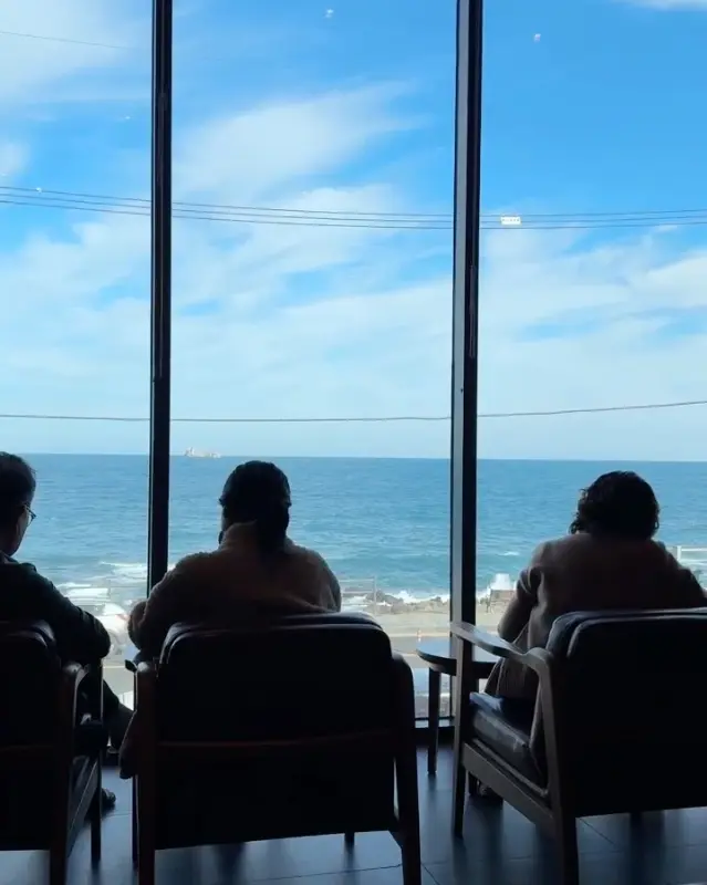 차를 세우고 매장 안으로 들어서니, 은은한 커피 향이 코끝을 간지럽혔다. 통유리창 너머로는 푸른 바다가 한눈에 들어왔다. 마치 거대한 스크린을 펼쳐 놓은 듯, 파도치는 바다와 하늘을 가르는 비행기가 한 폭의 그림처럼 펼쳐졌다. 1층에는 테이블이 몇 개 없었지만, 2층으로 올라가는 계단을 따라 발걸음을 옮겼다. 2층에 들어서는 순간, 탄성이 절로 나왔다. 넓은 공간 가득 채워진 테이블과 의자, 그리고 압도적인 오션뷰. 마치 바다 위에 떠 있는 듯한 착각을 불러일으켰다.