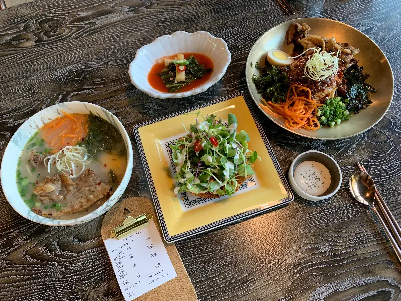 문을 열자, 따스한 햇살이 쏟아지는 창가 자리가 나를 반겼다. 은은하게 퍼지는 나무 향과 감각적인 인테리어는 마치 갤러리에 온 듯한 착각을 불러일으켰다. 매장은 넓고 깔끔했으며, 테이블 간 간격도 넉넉해서 편안하게 식사를 즐길 수 있는 분위기였다. 벽면을 장식한 제주 풍경 사진들은 여행의 설렘을 더욱 고조시켜 주었다. 아이와 함께 온 가족들을 위해 아기 식기류를 미리 준비해 놓는 세심함도 엿보였다.