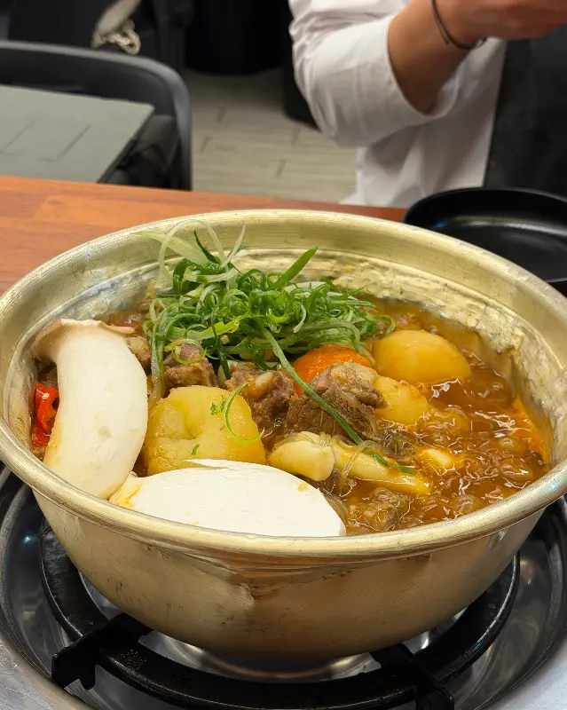 주문 후 얼마 지나지 않아, 테이블 위에는 먹음직스러운 갈비찜이 등장했다. 양푼 냄비에 담겨 보글보글 끓는 모습은 정말이지 식욕을 자극했다. 특히 큼지막한 갈비와 떡, 당면, 버섯, 그리고 싱싱한 채소가 듬뿍 들어간 모습은 사진으로 다시 봐도 군침이 돈다. 갈비는 이미 압력솥에 푹 삶아져 나와, 젓가락만 대도 살이 스르륵 분리될 정도로 부드러웠다. 국물은 보기만 해도 칼칼함이 느껴지는 붉은 색깔이었는데, 은은하게 퍼지는 매콤한 향이 코를 간지럽혔다.