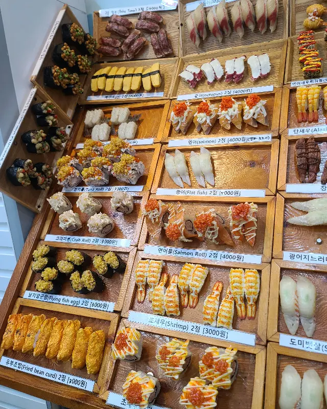 자리에 앉자마자 눈에 들어온 건 바로 초밥 모형 진열대! 와, 진짜 종류가 어마어마하더라. 하나하나 퀄리티도 장난 아니었어. 마치 진짜 초밥을 보는 듯한 착각이 들 정도였지. 여기서 먹고 싶은 초밥을 직접 골라서 주문하는 방식이더라고. 완전 신박했어! 뭘 먹어야 할지 고민하면서 진열대를 한참 동안 서성이게 되더라.