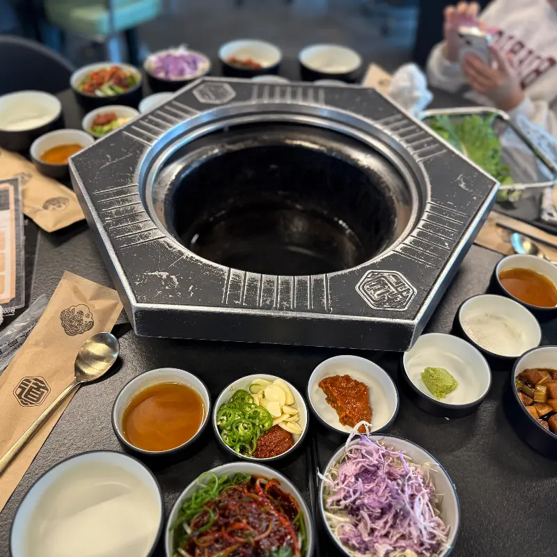 문을 열고 들어서는 순간, 고급스러운 인테리어에 압도당했어. 은은한 조명 아래 편안하게 식사할 수 있는 분위기. 테이블마다 놓인 묵직한 무쇠 불판이 시선을 사로잡는데, 뭔가 엄청 전문적인 느낌이 팍팍 들더라.