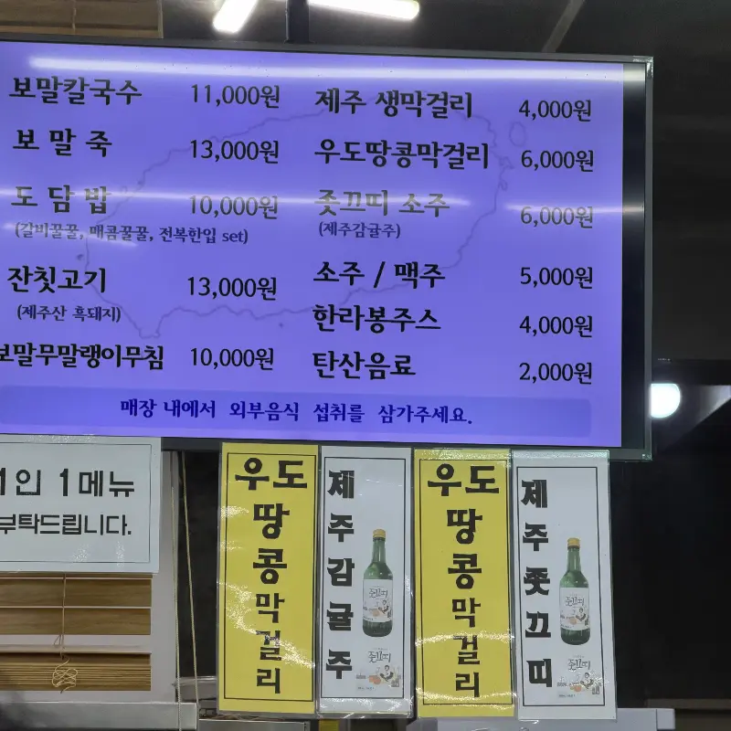 가게 문을 열자 따뜻한 온기가 온몸을 감쌌다. 바깥의 칼바람을 뚫고 온 터라 더욱 포근하게 느껴졌다. 테이블은 이미 손님들로 북적였지만, 다행히 한 자리가 남아있어 곧바로 앉을 수 있었다. 메뉴판을 펼쳐보니 보말칼국수, 보말죽, 도담밥 등 다양한 메뉴들이 눈에 띄었다. 메뉴판 옆 벽면에는 수많은 연예인들의 사인이 붙어있었다. 역시 유명한 곳은 다르구나, 라는 생각이 스쳤다. 잠시 고민하다가, 시그니처 메뉴인 보말칼국수와 보말죽을 하나씩 주문했다.