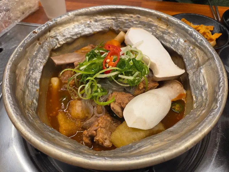 드디어 기다리고 기다리던 매운갈비찜 등장! 놋으로 된 양푼이에 담겨 나오는데, 비주얼부터 완전 압도적! 매콤한 향이 코를 찌르면서 식욕을 자극하는데, 진짜 이거 완전 미쳤다! 양도 어찌나 푸짐한지, 2인분인데 거의 3인분 같은 느낌? 갈비, 떡, 당면, 버섯, 야채 등등 재료도 아낌없이 팍팍 넣어주셨더라고. 특히 에린지 버섯이 통으로 들어가 있는 게 인상적이었어. 사진으로 봤을 때는 몰랐는데, 실제로 보니까 양이 진짜 어마어마하더라.