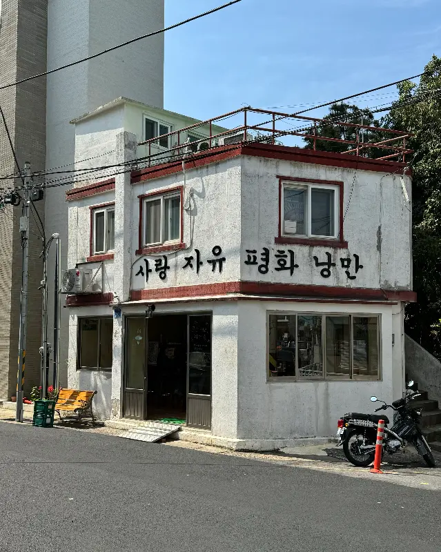 멀리서부터 보이는 하얀 건물이 어찌나 반갑던지. 낡은 듯하면서도 정감 있는 외관이, 마치 오랜 친구를 만나는 기분이었어. 건물 벽에 큼지막하게 쓰인 “사랑 자유 평화 낭만”이라는 글씨가, 왠지 모르게 가슴을 뭉클하게 만들더라고. 사진에서 봤던 바로 그 모습 그대로였어.