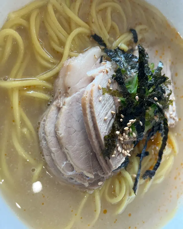 면발은 중면을 사용했는데, 쫄깃하면서도 부드러운 식감이 훌륭했다. 면 표면에 미세한 구멍들이 있어 국물이 잘 배어들었고, 덕분에 면만 먹어도 육수의 풍미를 제대로 느낄 수 있었다. 고기 고명은 돼지 특유의 잡내가 전혀 없이 깔끔했다. 지방과 살코기의 비율이 적절했고, 부드럽게 씹히는 식감이 일품이었다. 아마도 수비드 공법이나 저온 조리 방식을 사용한 듯했다. 고기의 단백질이 천천히 응고되면서 조직이 부드러워지고, 육즙이 그대로 보존되었기 때문이다.