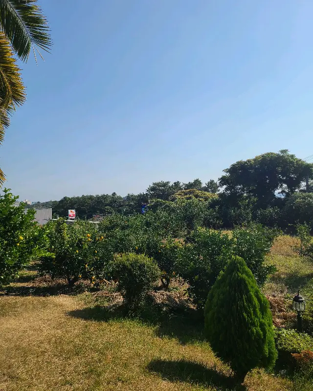 차를 몰아 도시정원에 가까워질수록 주변 풍경은 점점 더 싱그러워졌다. 푸른 하늘 아래 펼쳐진 감귤밭과 야자수, 그리고 돌담길은 제주 특유의 정취를 물씬 풍겼다. 드디어 도시정원 앞에 도착했을 때, 가장 먼저 눈에 들어온 것은 정갈하게 꾸며진 정원이었다. 싱그러운 잔디와 나무들, 그리고 형형색색의 꽃들이 어우러져 편안하고 아늑한 분위기를 자아냈다. 식당 입구에는 ‘오늘의 메뉴’를 적어놓은 칠판이 놓여 있었는데, 돔베고기, 제육볶음, 갈치구이 등 다채로운 메뉴들이 적혀 있어 보는 것만으로도 군침이 돌았다. 과 에서 볼 수 있듯이, 도시정원은 푸른 하늘과 초록빛 자연이 어우러진 아름다운 풍경 속에 자리 잡고 있었다. 식당 건물은 소박하면서도 정겨운 느낌이었고, 주변의 자연환경과 조화롭게 어우러져 편안한 분위기를 더했다.