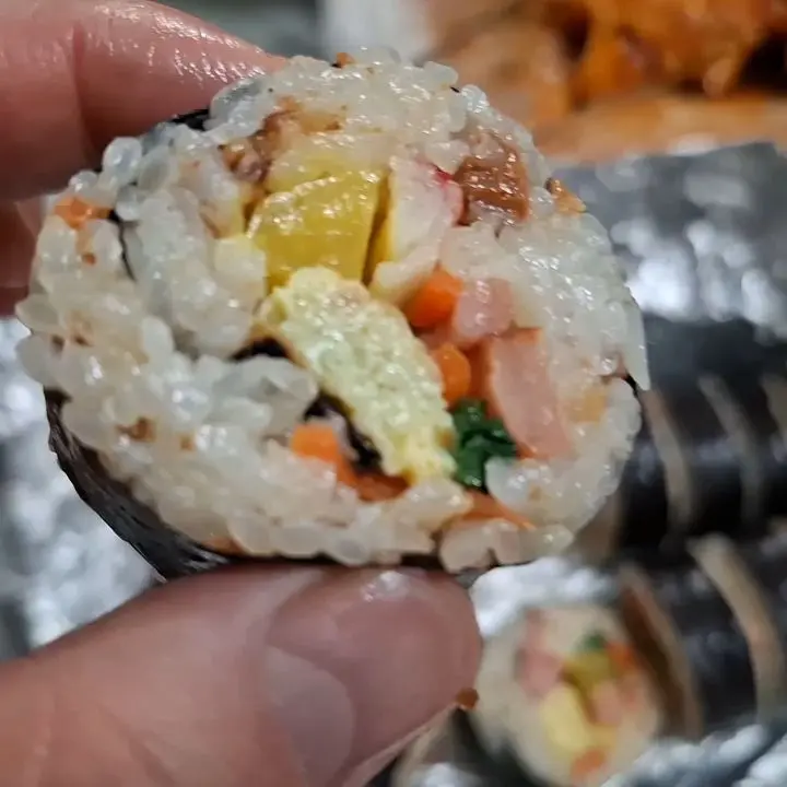 김밥 한 줄을 입에 넣으니, 바삭한 튀김 유부의 식감이 가장 먼저 느껴졌다. 짭짤하면서도 고소한 맛이 밥알과 어우러져 환상적인 조화를 이루었다. 밥알은 찰기가 넘쳤고, 신선한 재료들은 각각의 맛을 뽐내고 있었다. 특히, 튀긴 유부는 정말 신의 한 수였다. 김밥의 느끼함을 잡아주면서도, 씹는 재미를 더해주었다.