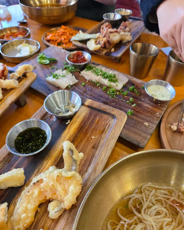 을 살펴보면 다양한 메뉴의 비주얼과 식당 내부 인테리어를 더욱 자세히 확인할 수 있다. 돔베고기의 윤기, 비빔국수의 새콤달콤한 양념, 그리고 깔끔하게 정돈된 테이블 세팅까지, 모든 것이 완벽했다. 혼자 여행하는 사람들을 위한 1인 세트 메뉴도 준비되어 있다고 하니, 부담 없이 방문해보는 것을 추천한다.