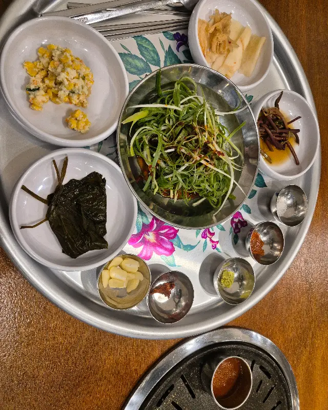 주문 후, 빠른 속도로 밑반찬이 세팅되었다. 커다란 쟁반에 정갈하게 담겨 나온 반찬들은 하나하나 정성이 느껴졌다. 특히 눈에 띄는 건 싱싱한 상추와 깻잎. 고깃집에서 흔히 볼 수 있는 시들시들한 채소가 아니라, 갓 밭에서 따온 듯 싱싱한 모습에 감탄했다. 멜젓, 쌈장, 마늘, 와사비 등 다양한 소스도 준비되어 있어 취향에 따라 즐길 수 있다는 점도 좋았다. 샐러드바가 있어서 밑반찬을 마음껏 가져다 먹을 수 있다는 점도 매력적이다.