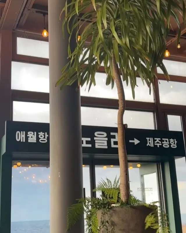 카페 곳곳에는 사진 찍기 좋은 포토존들이 많았다. 특히 카페 입구에 있는 ‘애월항’, ‘노을리’, ‘제주공항’ 안내판은 인증샷 명소! 나도 그냥 지나칠 수 없어서, 용기 내어 직원분께 사진을 부탁드렸다. 혼자 여행 왔지만, 사진 한 장 정도는 남겨야 하니까. 직원분께서 친절하게 사진을 찍어주셔서 정말 감사했다.