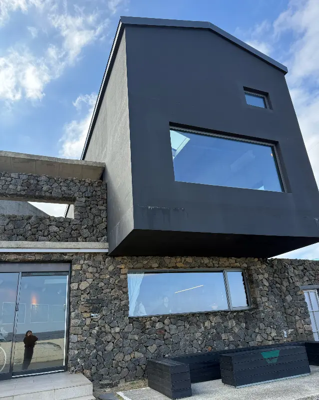 1층은 통창으로 제주 바다가 한눈에 들어오는 구조였다. 창밖으로는 푸른 바다와 현무암 해안이 펼쳐져 있었고, 햇살이 부서지는 모습은 그야말로 장관이었다. 창가 자리에는 이미 몇몇 사람들이 자리를 잡고 앉아 조용히 책을 읽거나 노트북을 하고 있었다. 나도 얼른 창가 자리에 앉아 멍하니 바다를 바라봤다. 복잡했던 머릿속이 깨끗하게 정화되는 기분이었다.