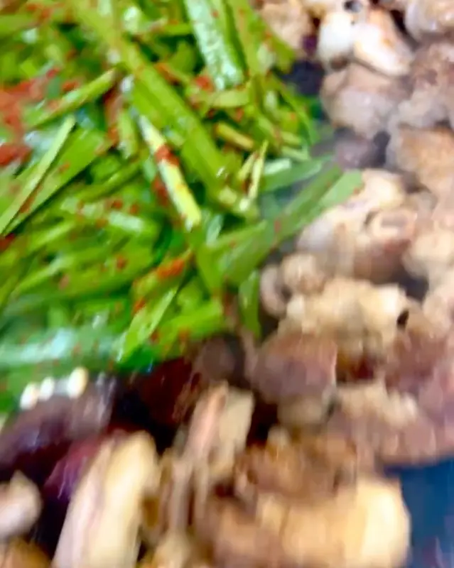 드디어 기다리고 기다리던 곱창이 등장했다. 초벌이 되어 나온 곱창은 기름기가 쫙 빠져 더욱 먹음직스러워 보였다. 곱창, 막창, 염통이 함께 구워져 나오는데, 그 양도 꽤 푸짐했다. 특히 곱창 안에 곱이 가득 차 있는 모습이 인상적이었다. 윤기가 자르르 흐르는 곱창을 보니 저절로 군침이 돌았다. 곱창 위에는 싱싱한 부추와 숙주가 듬뿍 올려져 있어 보기에도 좋고, 맛도 좋을 것 같았다. 를 보면 알겠지만, 곱창, 막창, 염통을 중심으로 숙주와 부추가 넉넉하게 올라가 있어 푸짐한 인상을 준다.
