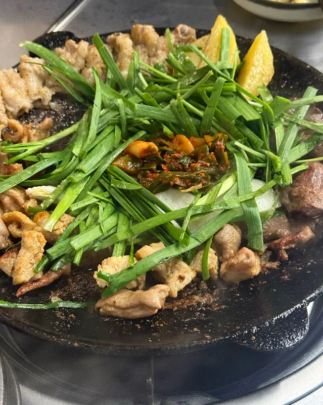 메뉴판을 펼쳐 들고 잠시 고민에 빠졌다. 곱창, 대창, 막창… 하나같이 매력적인 이름들이 나를 유혹했다. 결국, 다양한 부위를 한 번에 맛볼 수 있는 모둠구이를 선택했다. 잠시 후, 기다림 끝에 드디어 모습을 드러낸 곱창 모둠은 그 비주얼부터 압도적이었다. 윤기가 자르르 흐르는 곱창 위에는 신선한 부추와 대파김치가 듬뿍 올려져 있었고, 그 옆으로는 노릇하게 구워진 감자가 자리하고 있었다. 불판이 달궈지자, 지글거리는 소리와 함께 고소한 냄새가 코를 자극하며 식욕을 돋우었다.