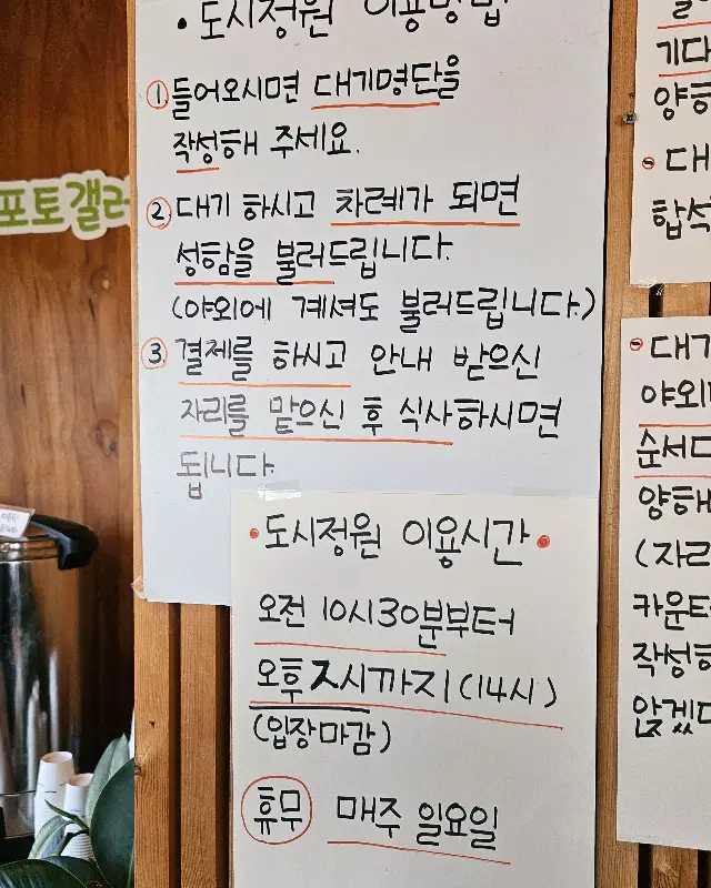 식당 한 켠에는 ‘도시정원 이용방법’이 적힌 안내문이 붙어 있었다. 대기 명단을 작성하고, 순서대로 호명을 받으면 결제를 한 후 자리를 안내받는 시스템이었다. 영업시간은 오전 10시 30분부터 오후 2시까지이며, 매주 일요일은 휴무라고 한다. 헛걸음하지 않도록 미리 확인하는 것이 좋겠다.