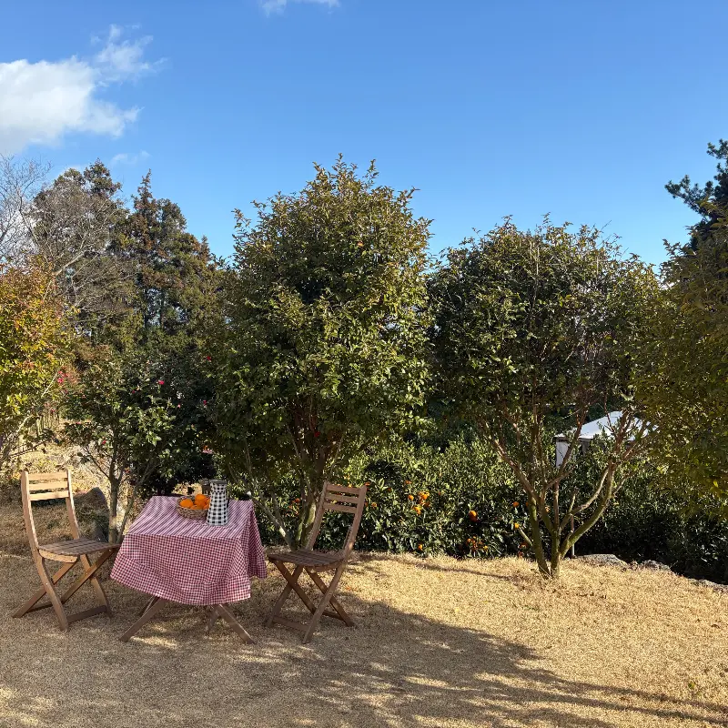따스한 햇살 아래, 감귤밭을 배경으로 놓인 테이블이 인상적입니다.
