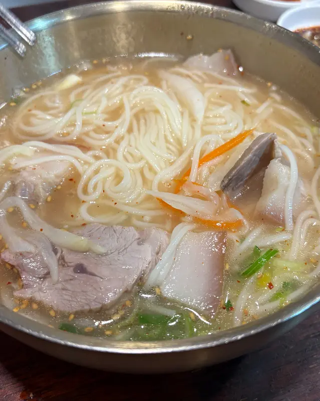 금복식당의 고기국수는 닭육수를 사용했다는 평도 있는데, 묵직하면서도 깔끔한 뒷맛이 여느 고기국수와는 차별화된 매력을 선사한다. 뽀얀 국물 위에는 잘게 썬 파와 고춧가루가 살짝 뿌려져 있어, 느끼함 없이 깔끔하게 즐길 수 있었다.